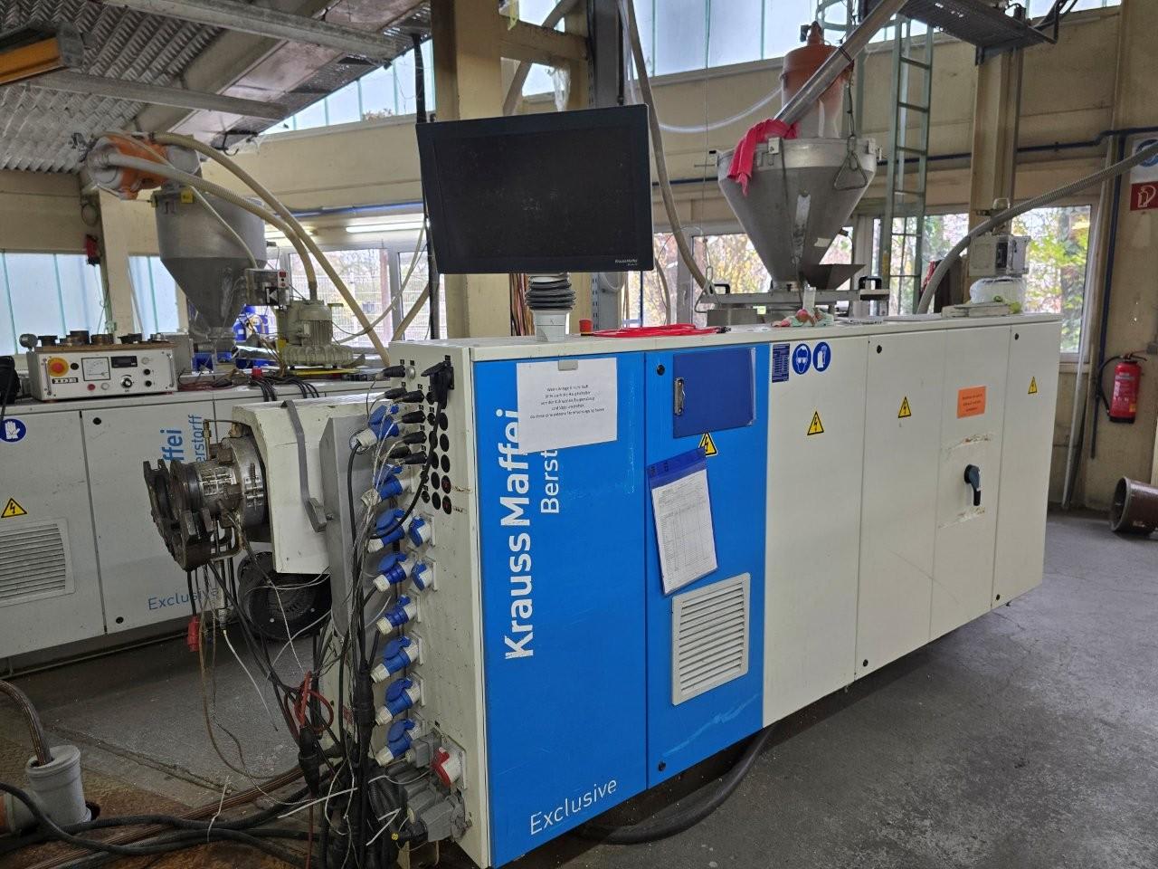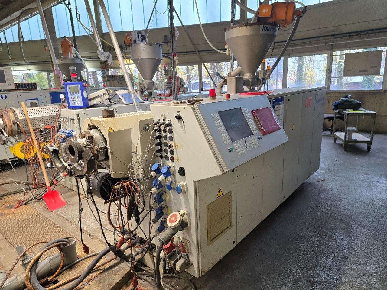 - Conical Twin-Screw-Extruder KRAUS - MAFFEI KMD 43 K/P | 2011screw dia 43mm, Capacity: max 150kg/h, KraussMaffei-Berstorff control, weight 2,3 to /// Drive: SIEMENS 2860 / 30,5 rpm, 5.070 Nm, weight 1,2to